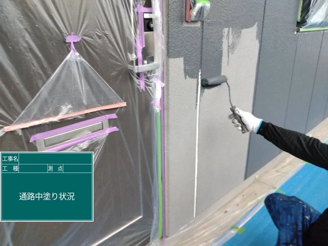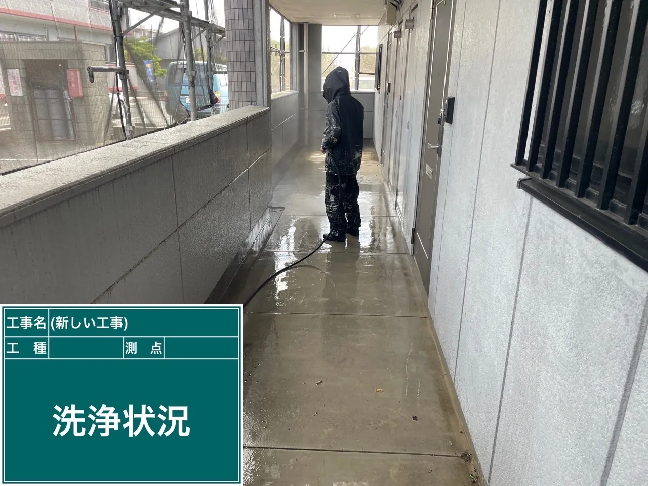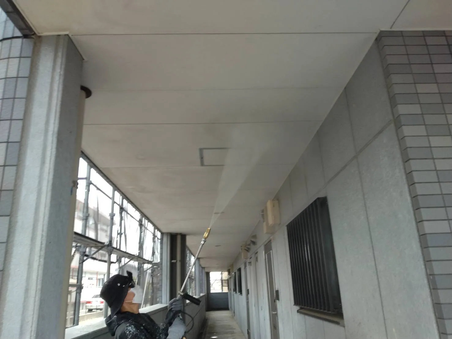 菊陽町アパートの下塗り状況です!今日は雨の為、雨の当たらない通路面の塗装を行っております。