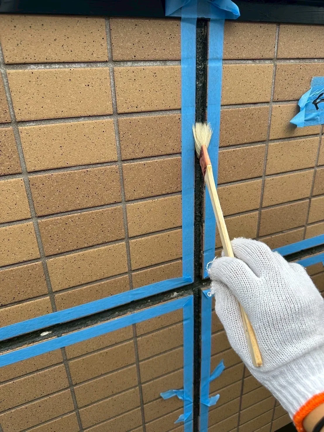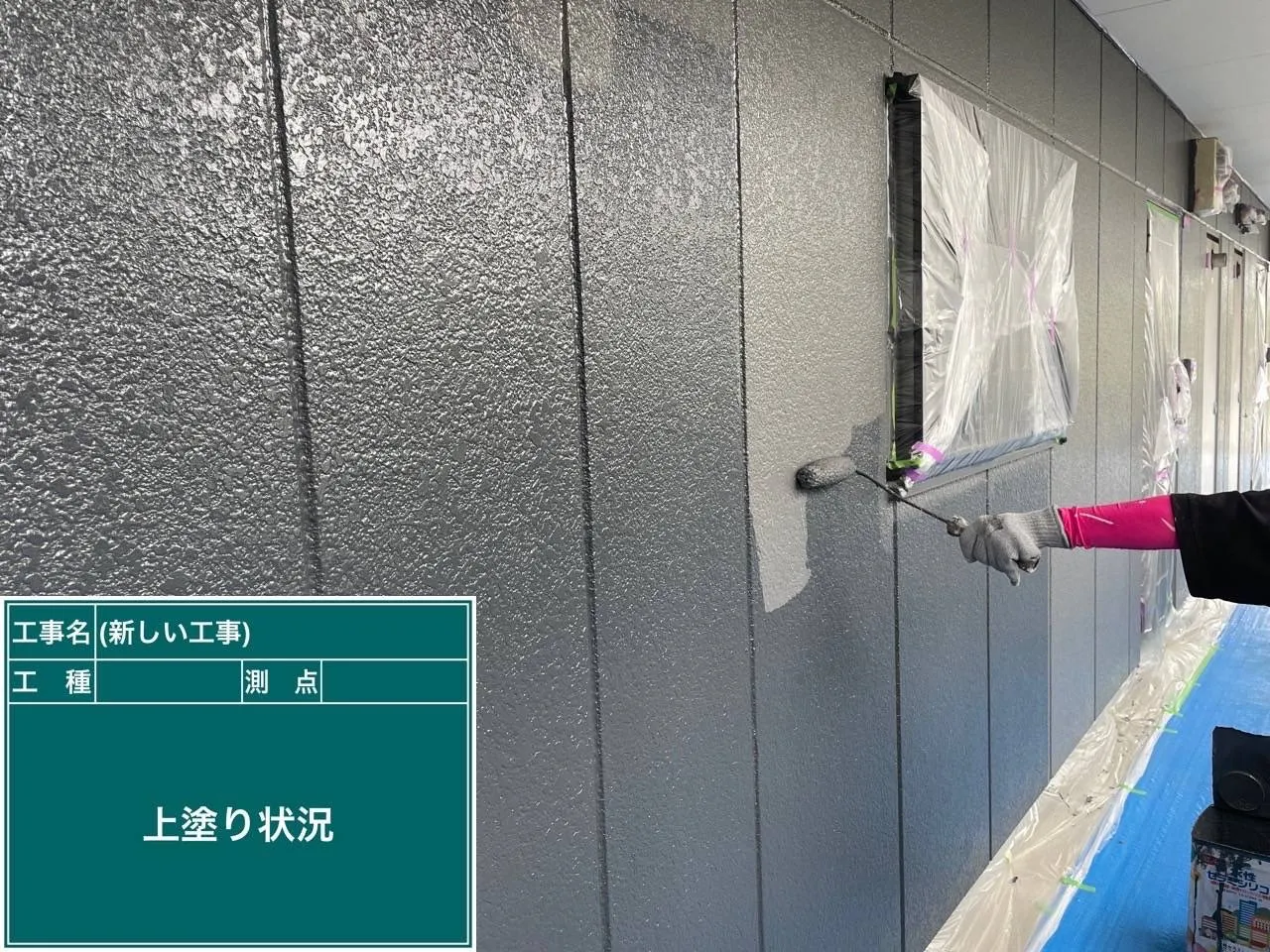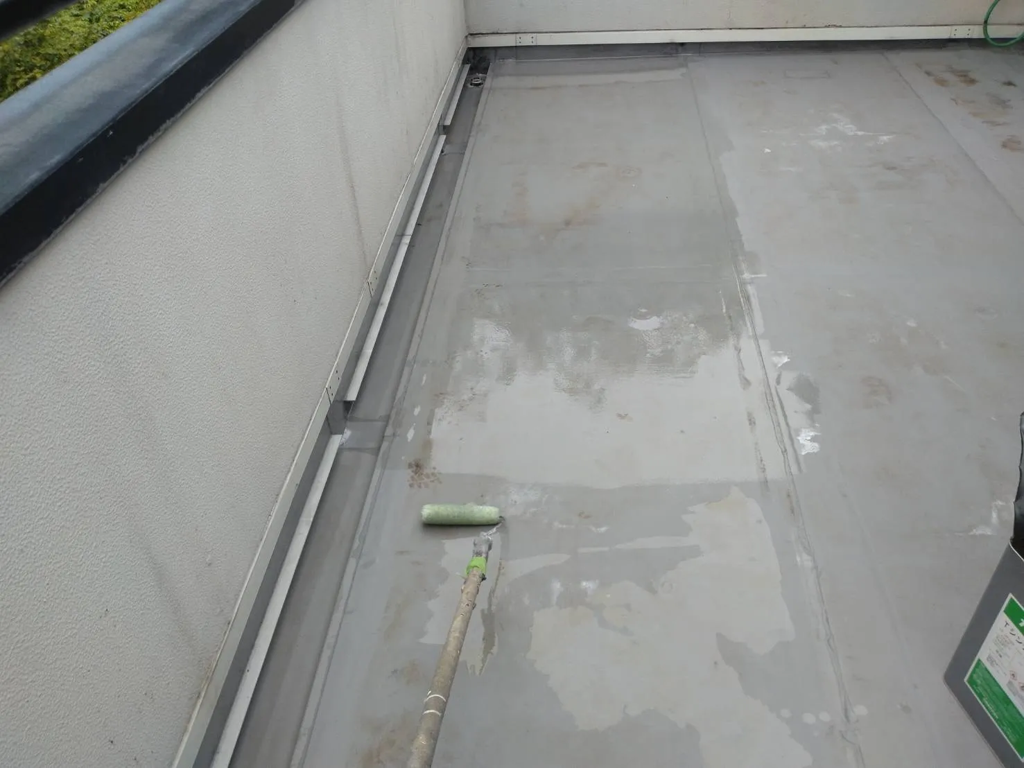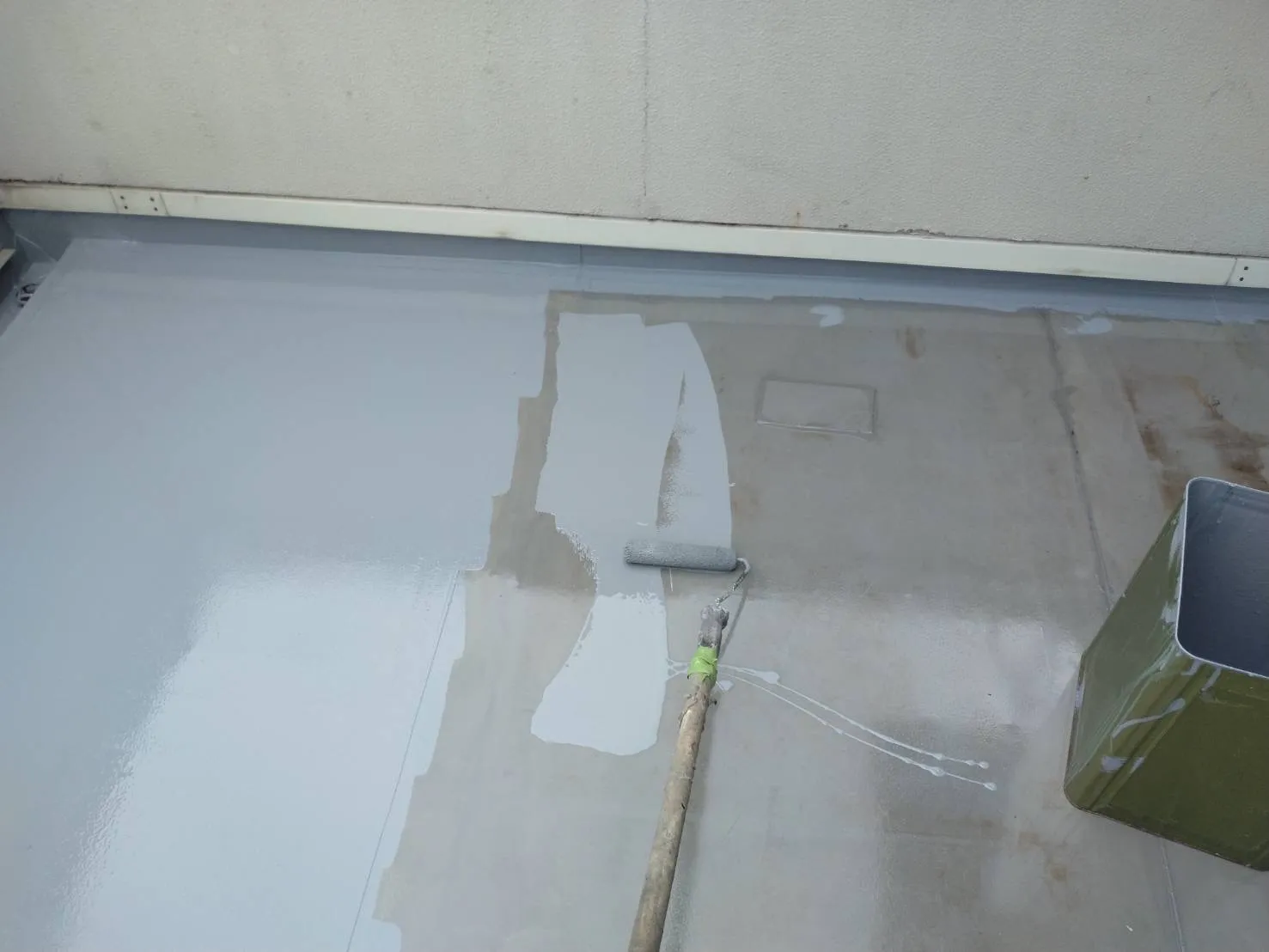 菊陽町アパートの下塗り状況です!今日は雨の為、雨の当たらない通路面の塗装を行っております。