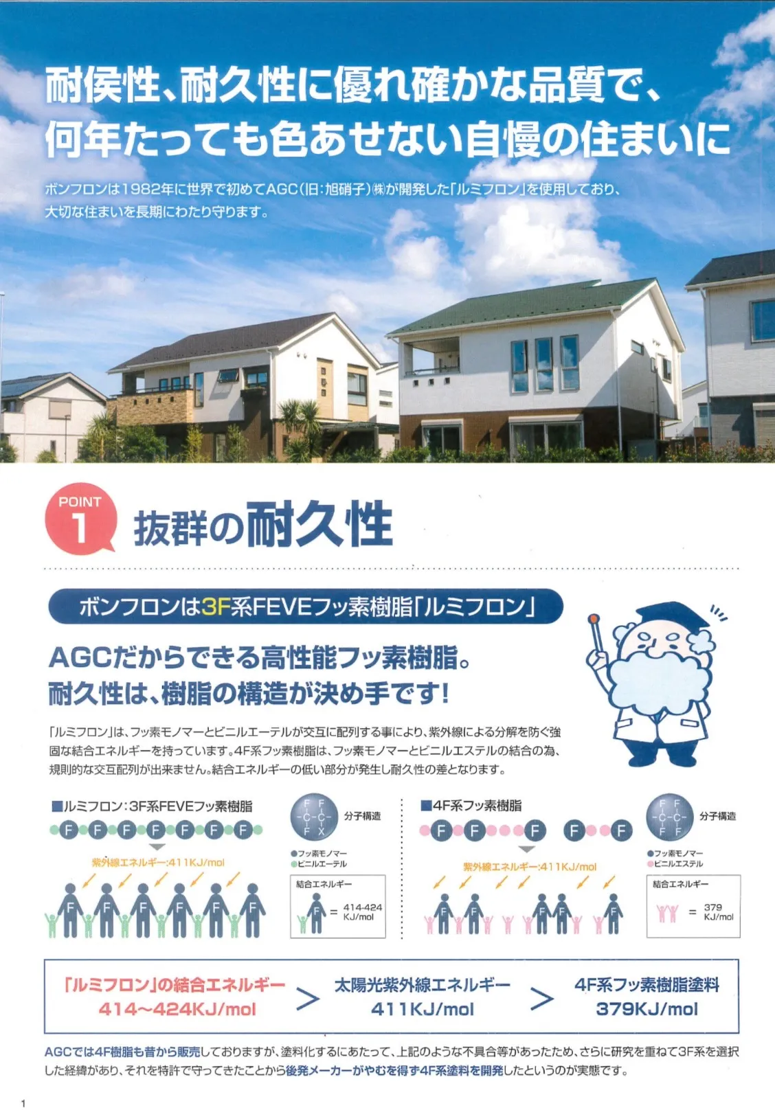 今回は、AGCの塗料のお話です。AGCの塗料の特徴は、天然石のホタル石わつかった、世界初の塗料用フッ素樹脂『ルミフロン』を原料としています。ルミフロンとは、分子の配列が交互になることで結合力が強…